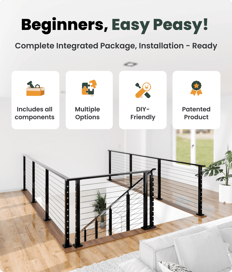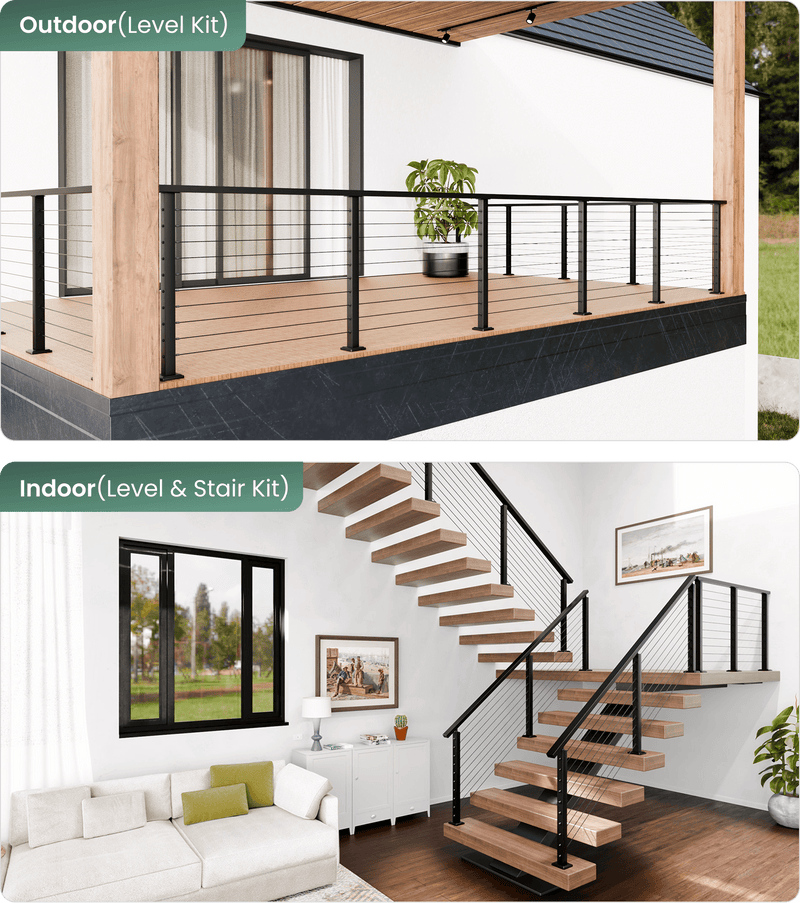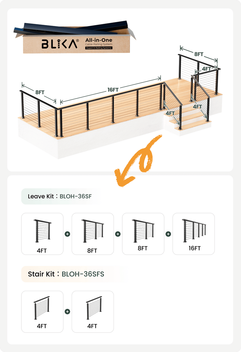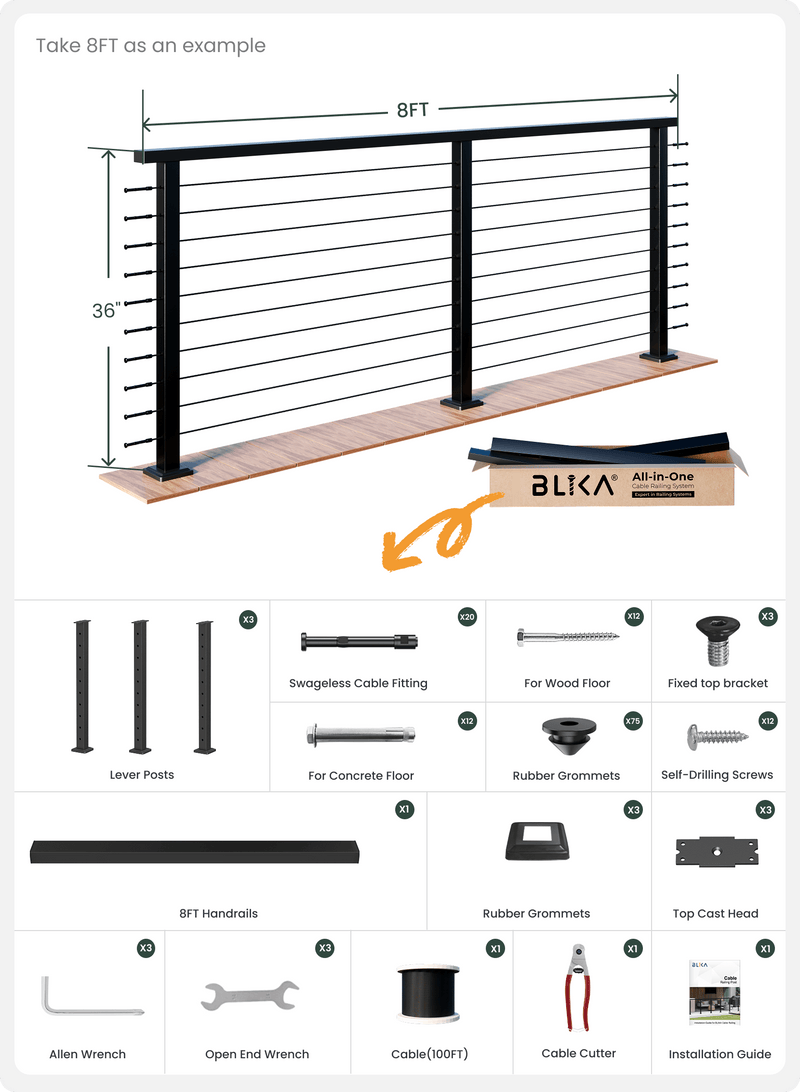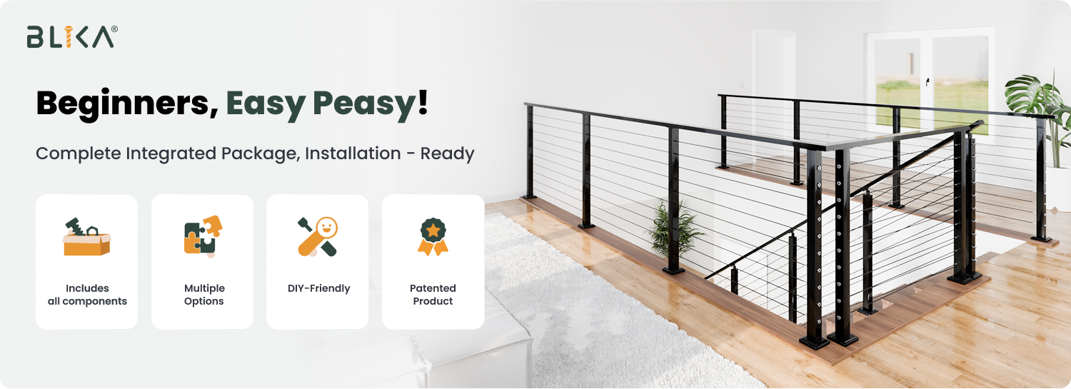 Everything You Need – This comprehensive BLIKA all-in-one cable railing kit includes high-quality black powder-coated posts, black stainless steel cables, swageless tensioners, protective rubber sleeves, a durable cable cutter, and all the essential installation tools. It also comes with a step-by-step instruction guide, making it a complete, hassle-free solution for your DIY railing project.