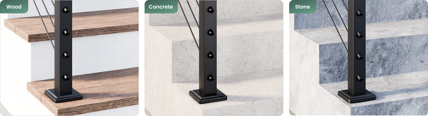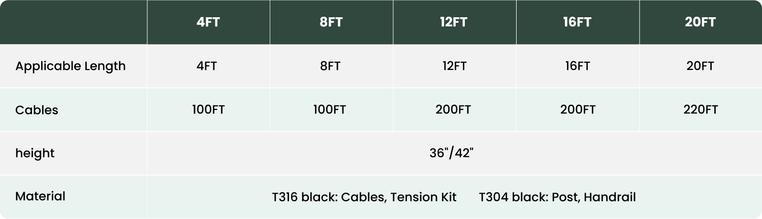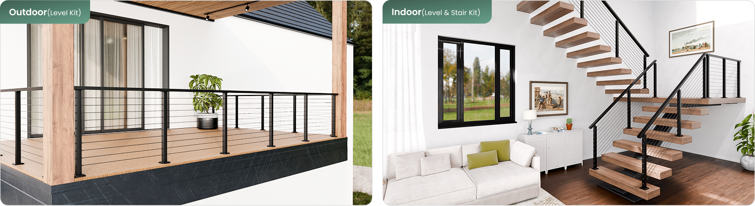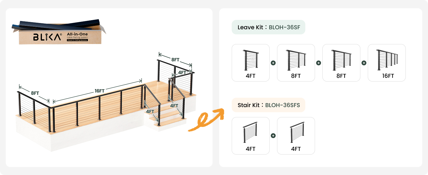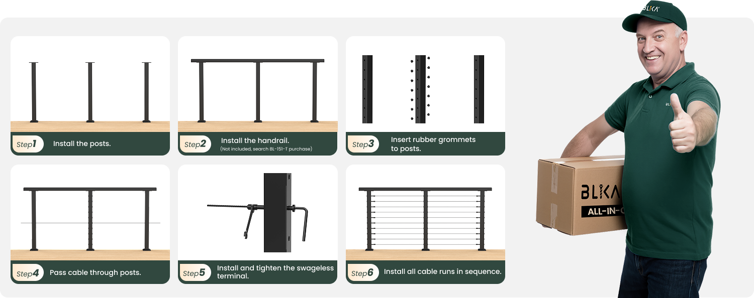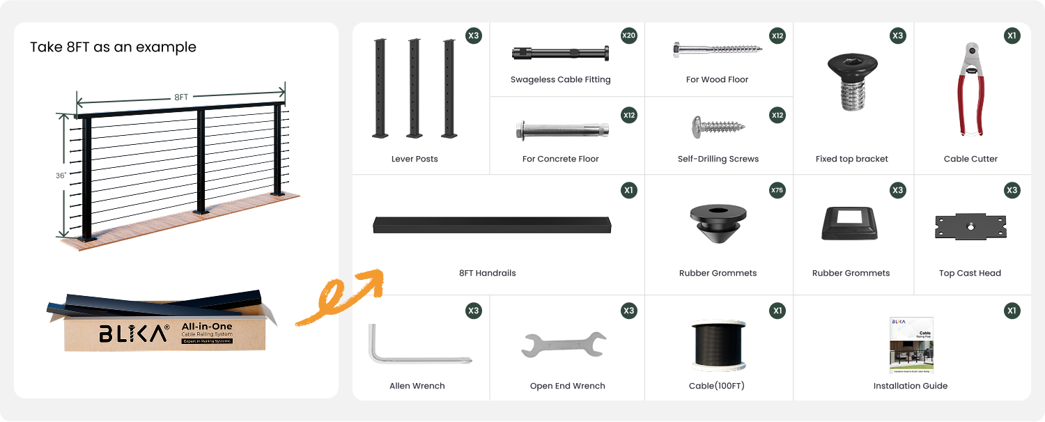 Everything You Need – This comprehensive BLIKA all-in-one cable railing kit includes high-quality black powder-coated posts, black stainless steel cables, swageless tensioners, protective rubber sleeves, a durable cable cutter, and all the essential installation tools. It also comes with a step-by-step instruction guide, making it a complete, hassle-free solution for your DIY railing project.