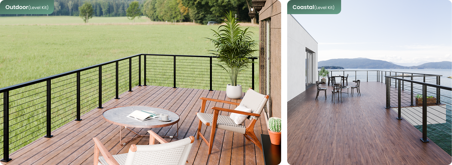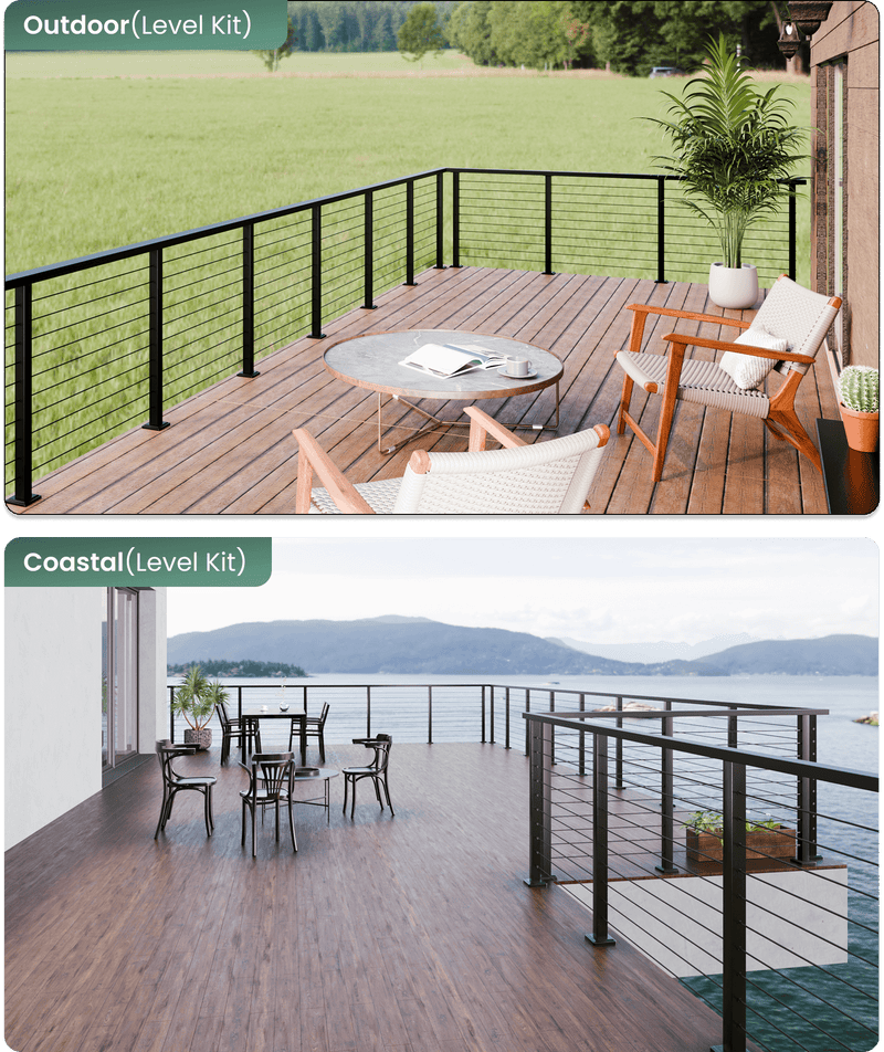 This premium Level Cable Railing Kit is specifically designed for expansive horizontal decks and patios. Unlike traditional, bulky railings, the slim, marine-grade Stainless Steel Cable Infill creates an unrivaled, unobstructed line of sight, perfectly showcasing the breathtaking beauty of your outdoor space.