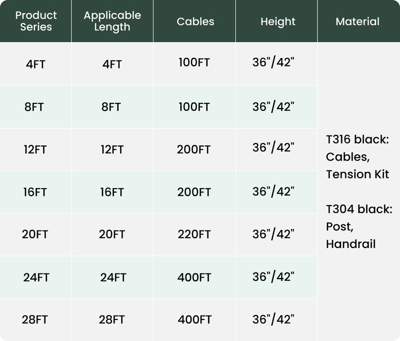 • Complete 4FT-28FT all-in-one kit includes 36" & 42" black surface mount level-drilled posts (no handrail).