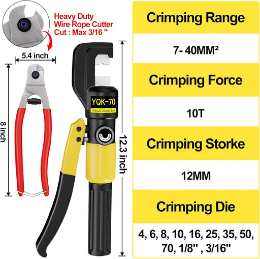 【Compatibility】Crimps 12 AWG to 2/0 AWG size copper and aluminum wires. Maximum crimping power: 10 tons. Crimping Stroke : 12mm. The hydraulic cri...