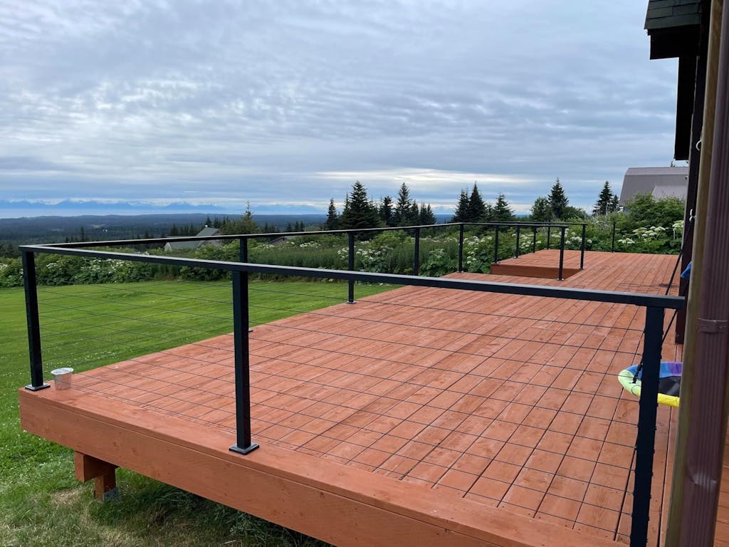 We decided to paint our old deck this fun turquoise color and didn't want heavy wood pickets ruining the vibe. We grabbed this BLIKA stainless steel cable to run through the wood posts ourselves. The quality is great it cuts clean and doesn't fray. The best part is the wire ropes are so thin you can see right through them (nice view of Old Glory in the back!). It was way cheaper than buying a full cable railing system diy kit, we just drilled the holes and installed the hardware. Super happy with the fresh look.