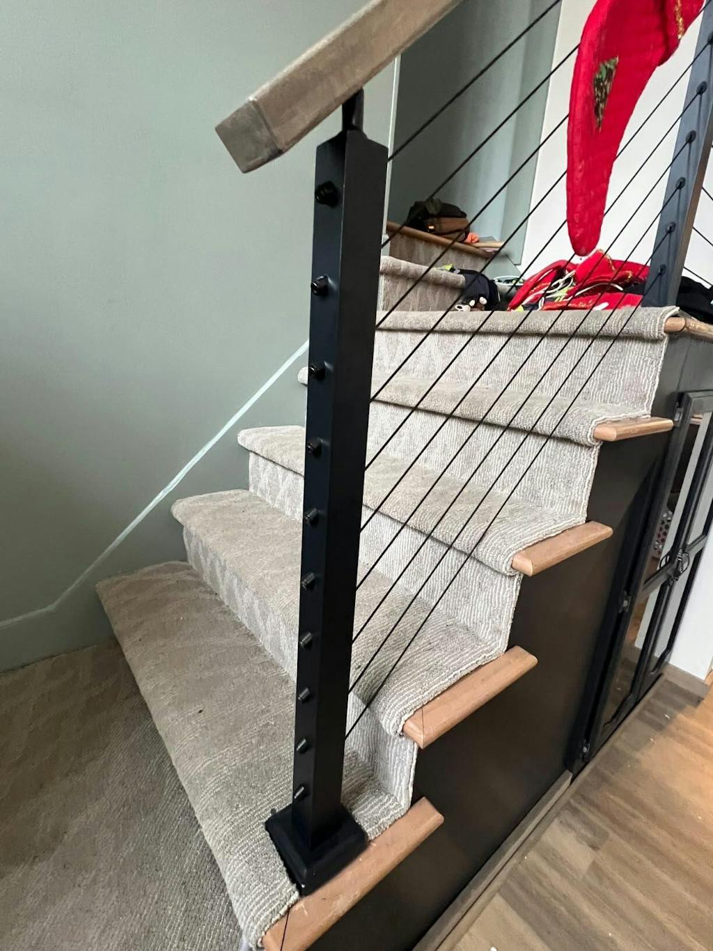 We chose BLIKA posts because we wanted to create a sense of openness. The matte black finish complements our dark green wall paint perfectly. These posts are incredibly sturdy and durable. I was a little worried they might wobble beforehand, but once bolted to the subfloor, they're very secure. Installing them on a carpeted floor was a bit tricky, but it was all worth it. Last night we laid the stainless steel cables and tightened them. It looks very neat and tidy.